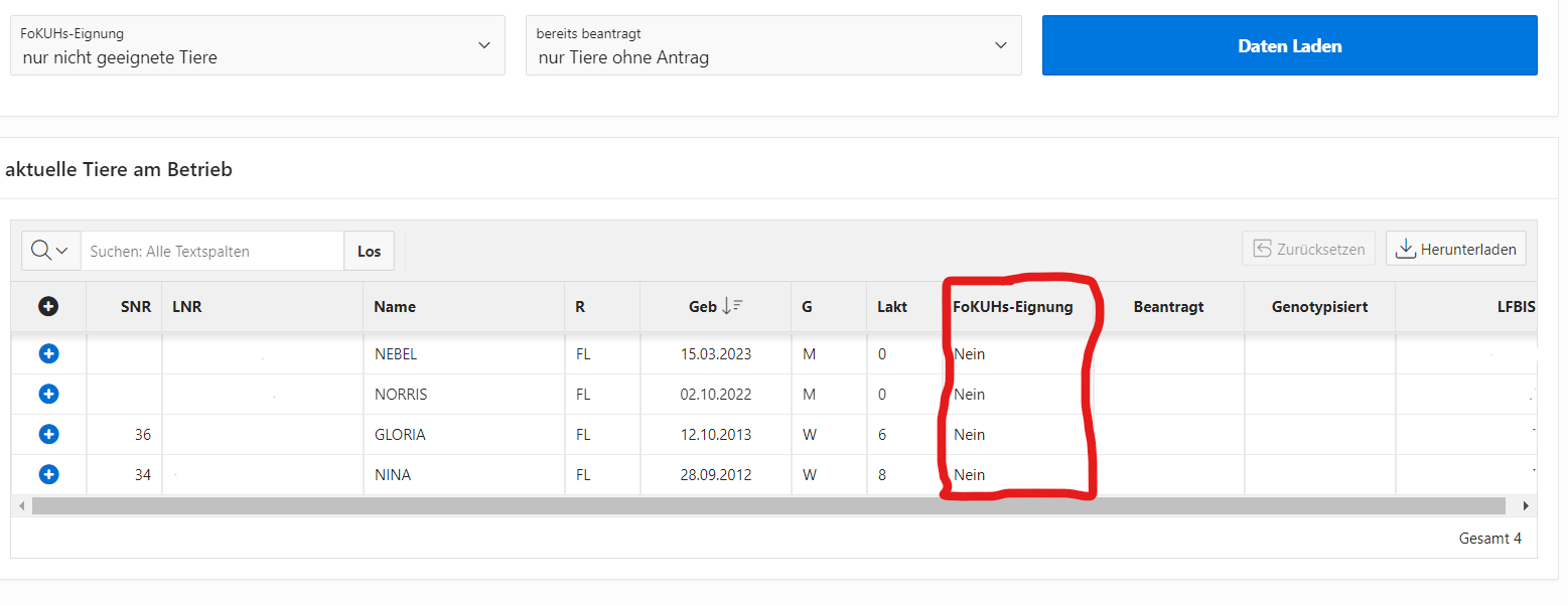 Das folgende Beispiel listet Ihnen Tiere die nicht beantragt sind und aber auch nicht für FoKUHs geeignet sind. Norris und Nebel sind männlich und daher nicht geeignet für FoKUHs, Gloria und Nina sind aufgrund ihrer hohen Laktation nicht mehr für FoKUHs geeignet.