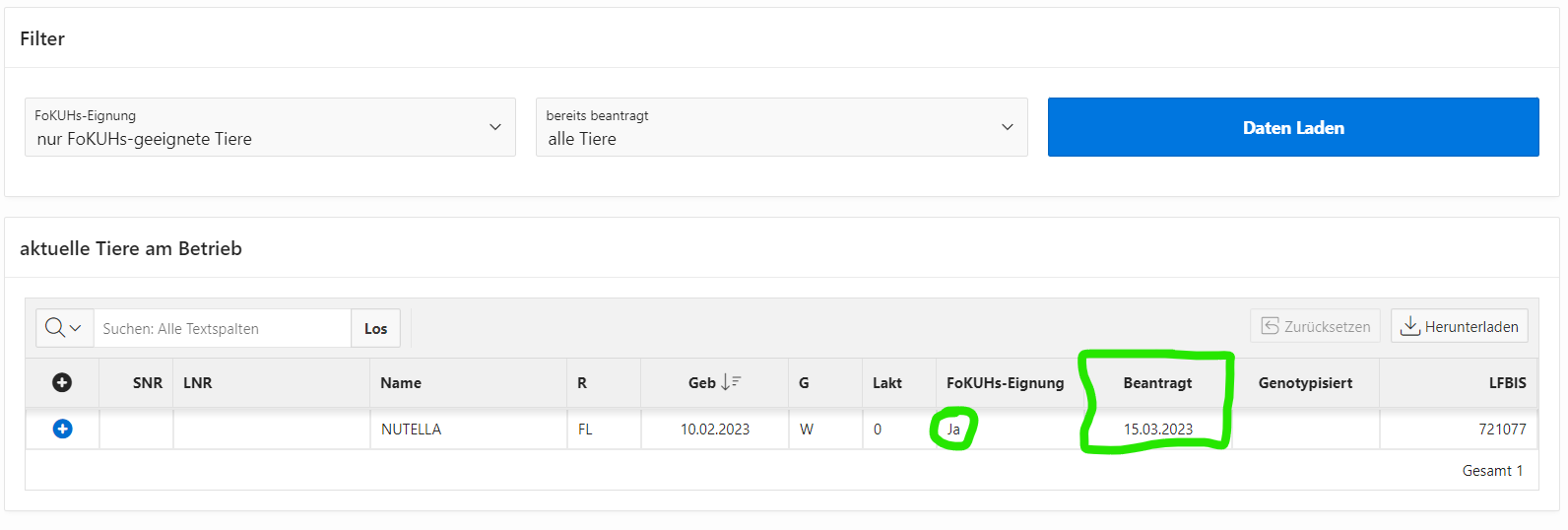 Wählen Sie beispielsweise nur FoKUHs geeignete Tiere und alle Tiere dann sehen Sie eine Liste von Tieren, die im Rahmen des Projekts FoKUHs zur Genotypisierung geeignet sind - unabhängig davon ob sie bereits beprobt wurden oder nicht. Im folgenden Bild ist ein FoKUHs geeignetes Tier gelistet. Aus der Tabelle geht hervor, dass am 15.03.2023 ein Typisierungsantrag für dieses Tier gestellt wurde.