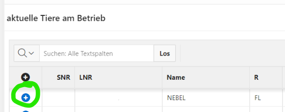 Wenn Sie direkt aus dieser Maske für ein Tier einen Antrag stellen wollen, so drücken Sie auf das blaue Plus Symbol in der ersten Spalte des betroffenen Tieres.