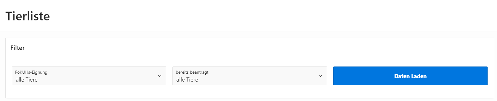 Landwirte können in der Tierliste ihren eigenen aktuellen Tierbestand abfragen und nach FoKUHs-Eignung filtern. Direkt aus der Tierliste kann anschließend ein Antrag gestellt werden.