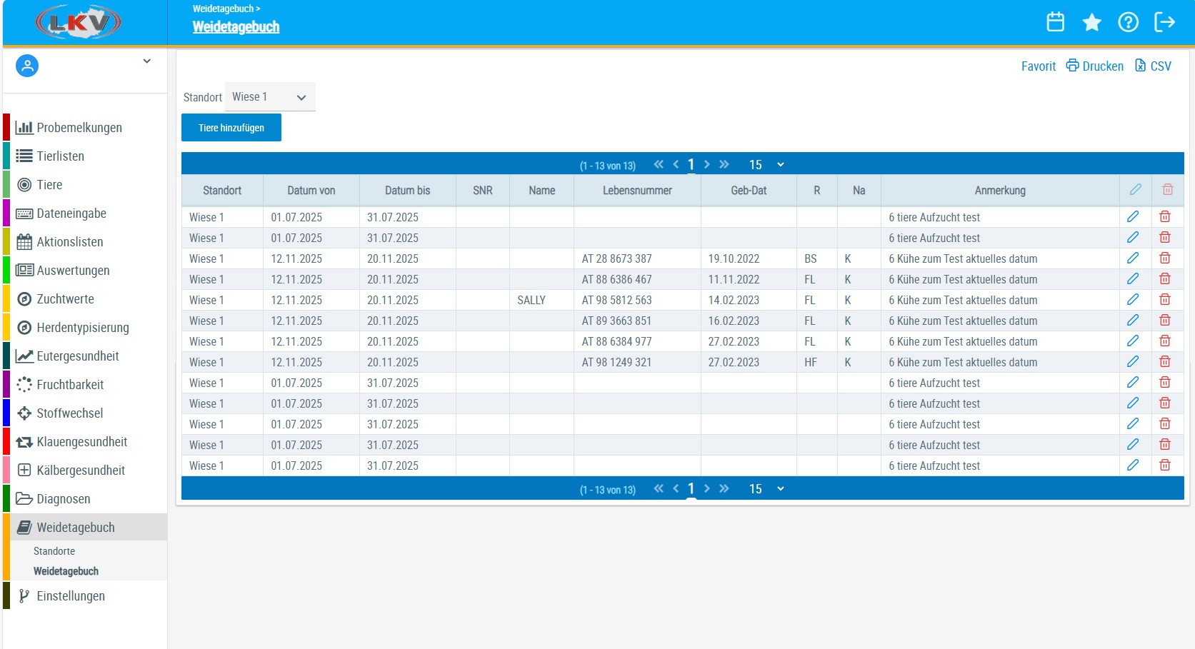 Es ermöglicht die Aufzeichnnung der Weidehaltung. Die Tiere können über eine einfache Auswahl mittels Checkbox einem definierten Standort und einem festgelegten Datum zugewiesen werden.