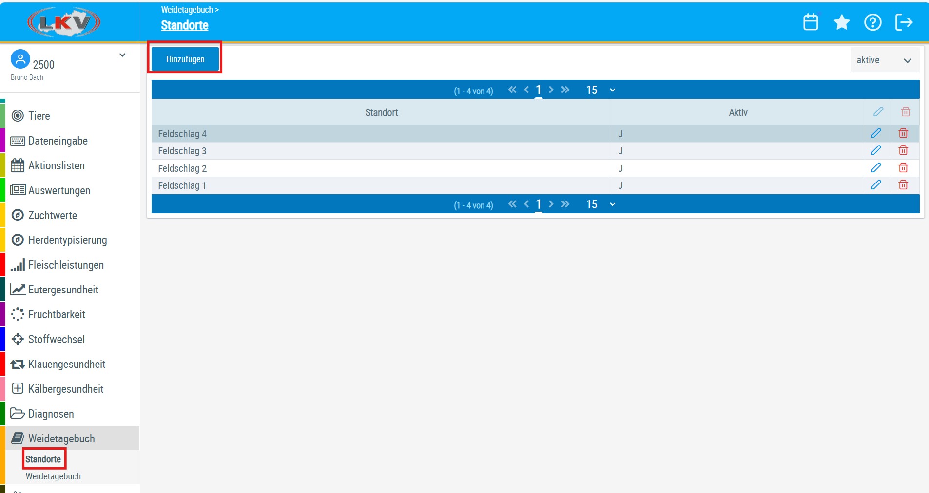 Im Seitenmenü unter dem Weidetagebuch findet man die Standorte, unter diesem Menüeintrag müssen die Weidestücke eines Betriebes definiert werden. Erst danach kann man mit dem führen eines Weidetagebuches für seinen Betrieb beginnen.