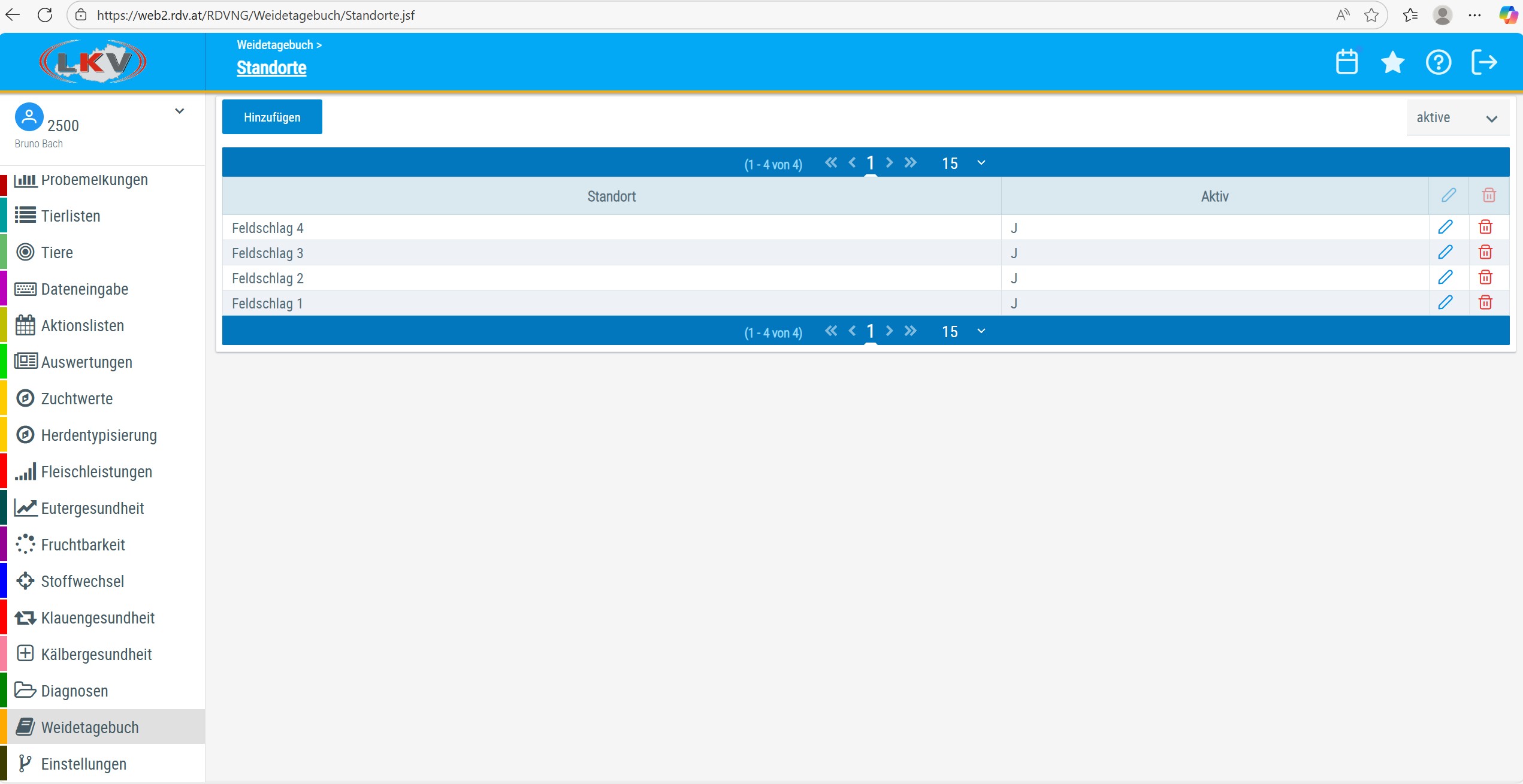 Es ermöglicht die Aufzeichnnung der Weidehaltung. Die Tiere können über eine einfache Auswahl mittels Checkbox einem definierten Standort und einem festgelegten Datum zugewiesen werden.