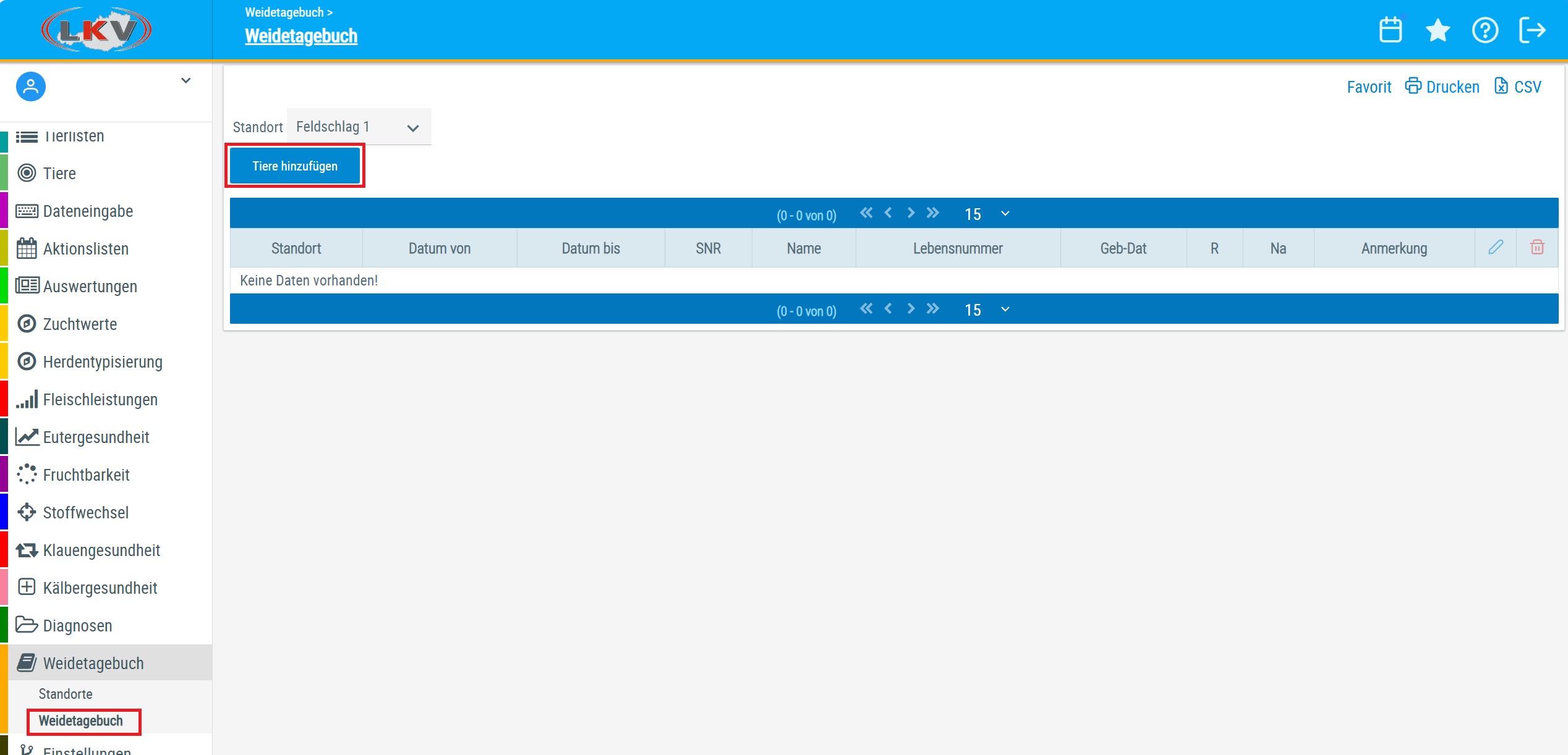Im Seitenmenü unter dem Weidetagebuch findet man das Weidetagebuch, unter diesem Menüeintrag müssen die Tiere einer Weide zugeordnet werden. Wichtig dabei ist es, dass ein Tier eines Betreibes zur selben Zeit nur auf einer Weide stehen kann.