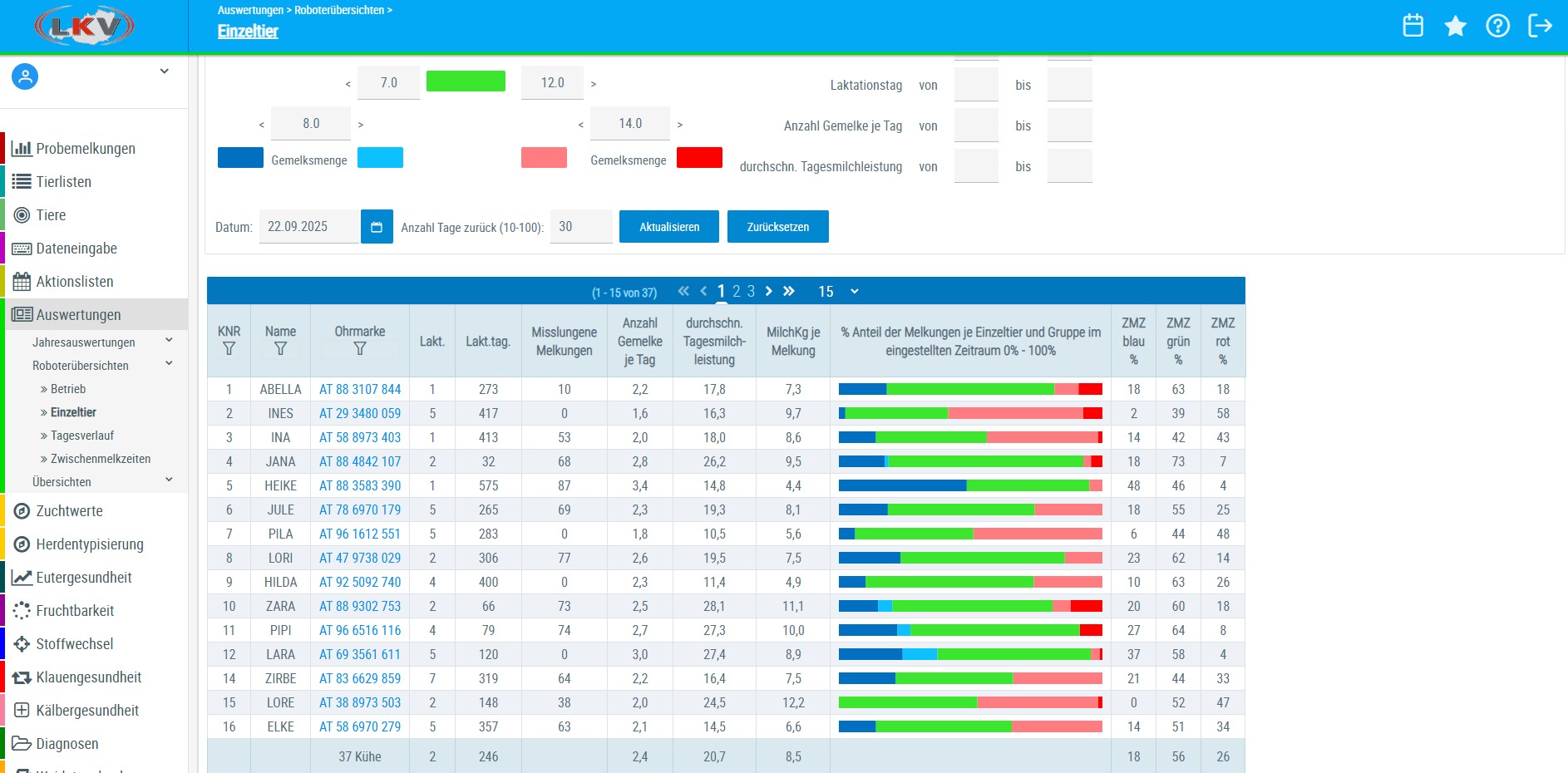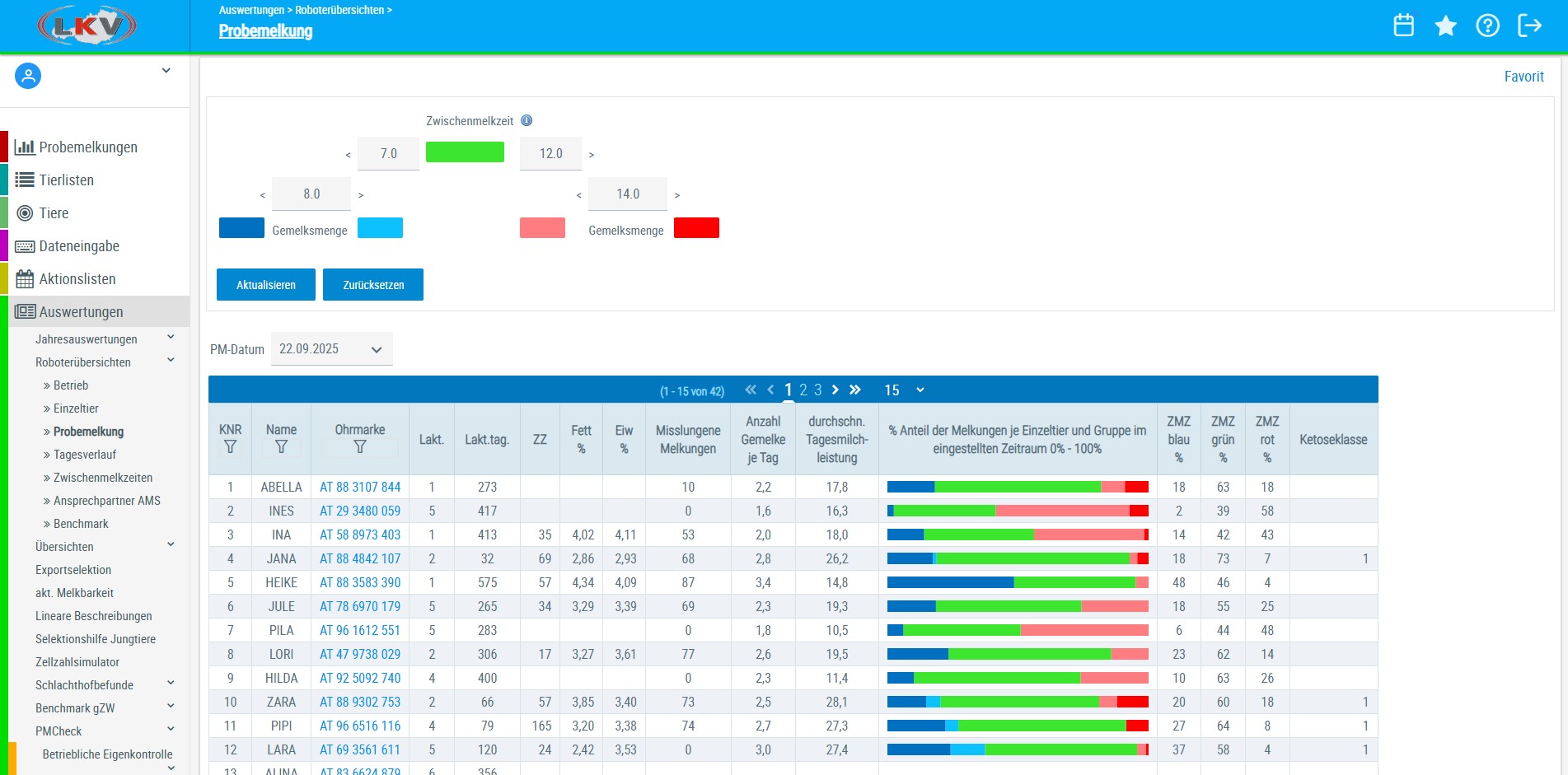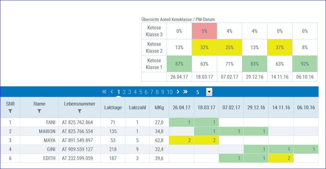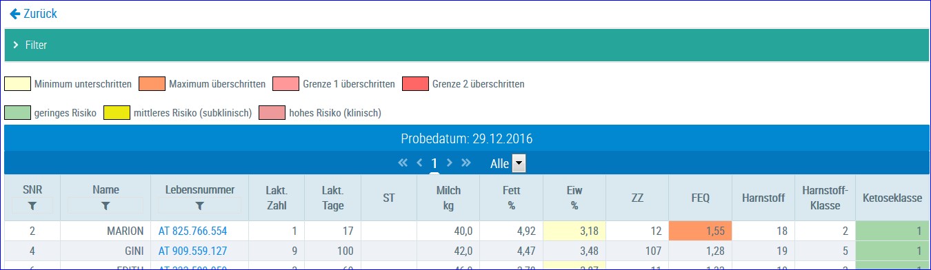 Die Ansicht bei der Auswertung für die Probemelkungen wurde an die Ansicht Einzeltier angepasst. Es gibt nun auch die 5 Farben und eine genauere Information dazu.