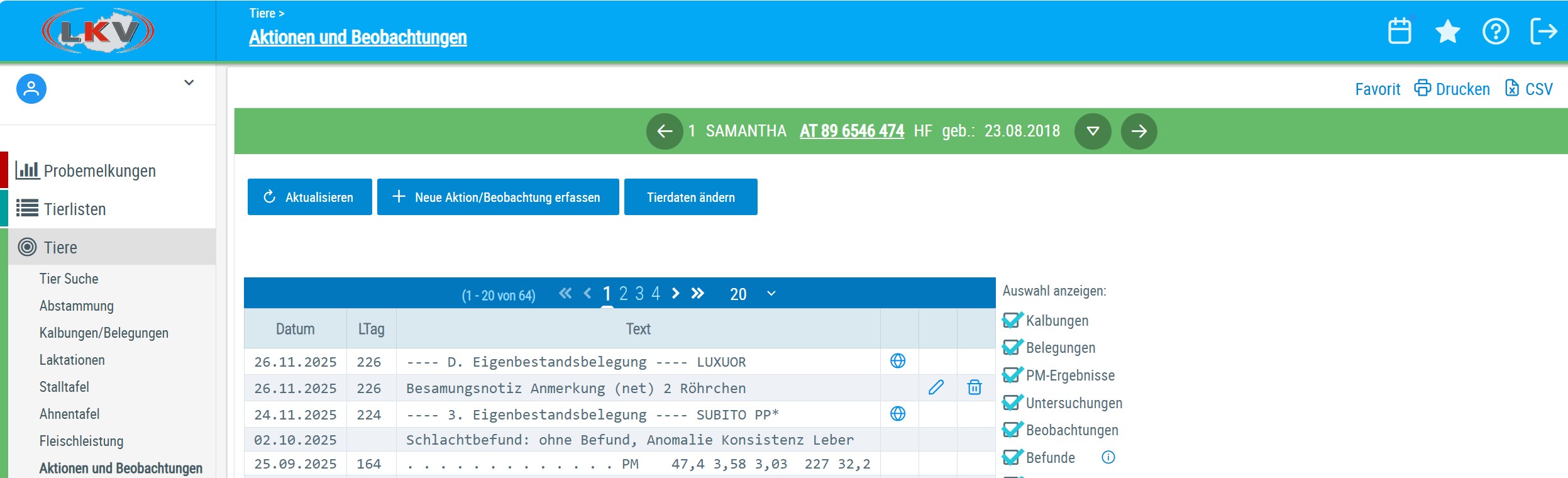 Unter Aktionen und Beobachtungen sieht man die Anmerkungen, die bei der Eigenbestandsbesamung eingetragen wurde.