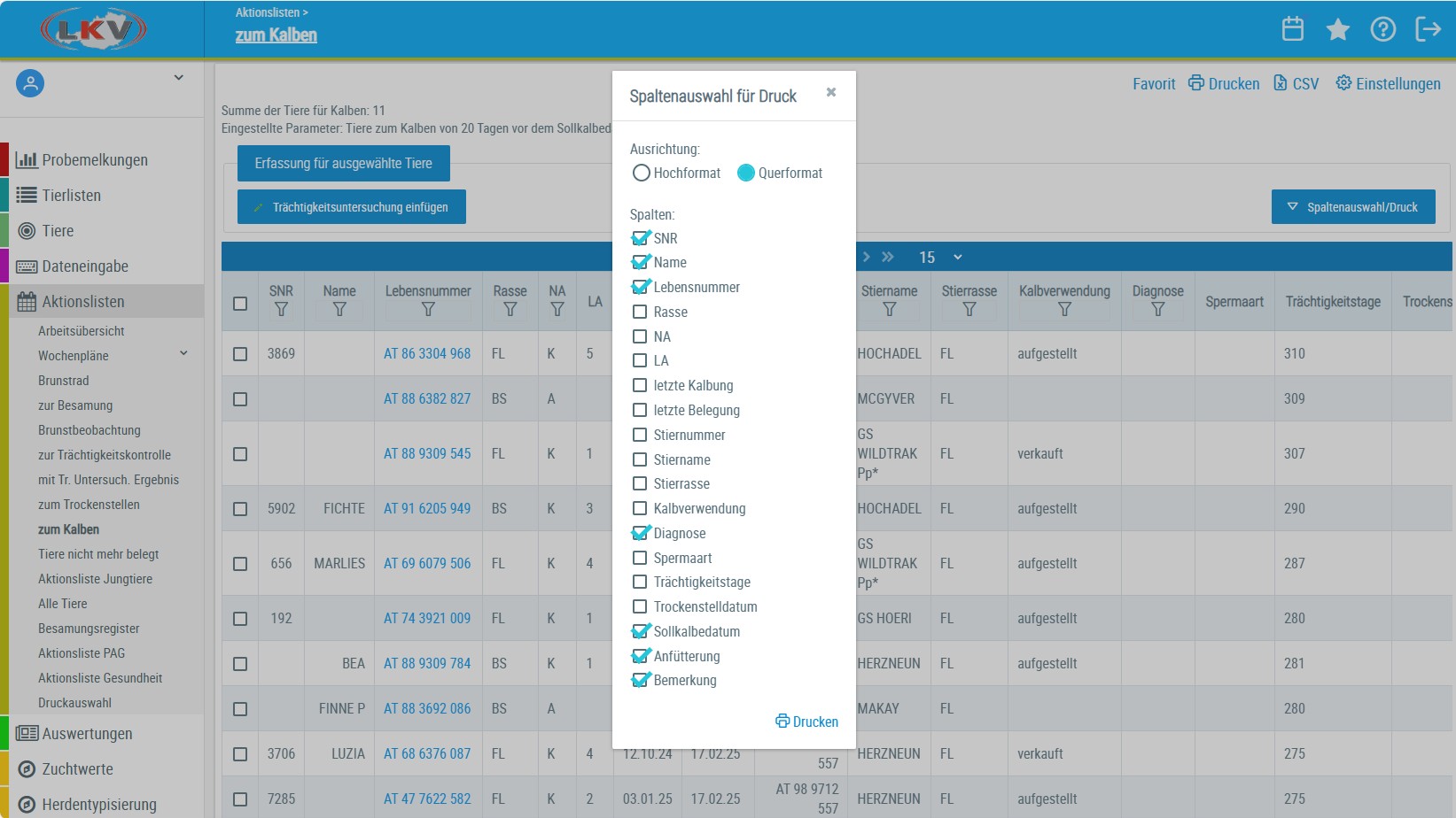 Bei allen Ansichten, welche eine Spaltenauswahl erlauben kann auch gewählt werden ob im Hoch- oder Querformat gedruckt werden soll um eine optimale Nutzung der Seite zu erlauben.
