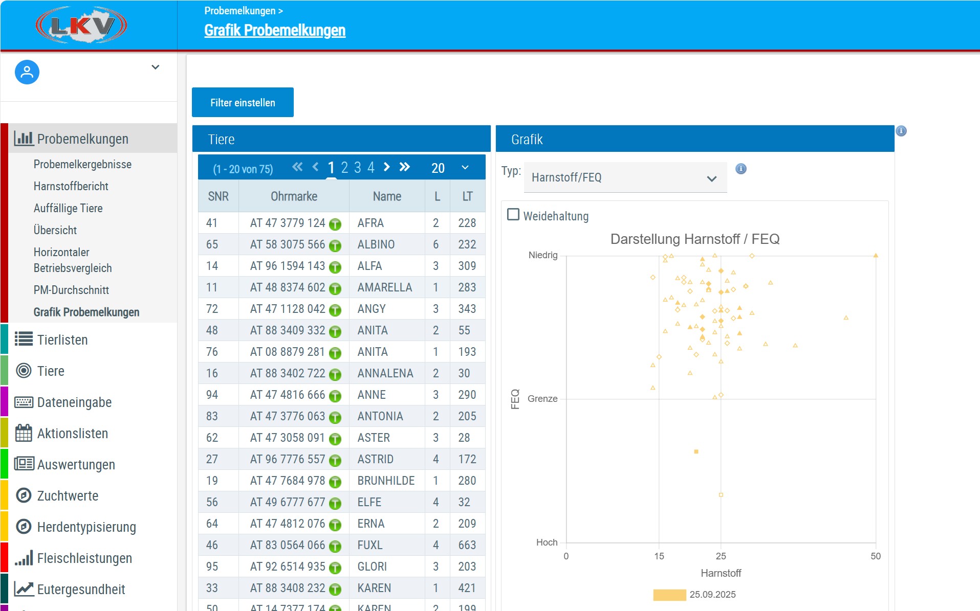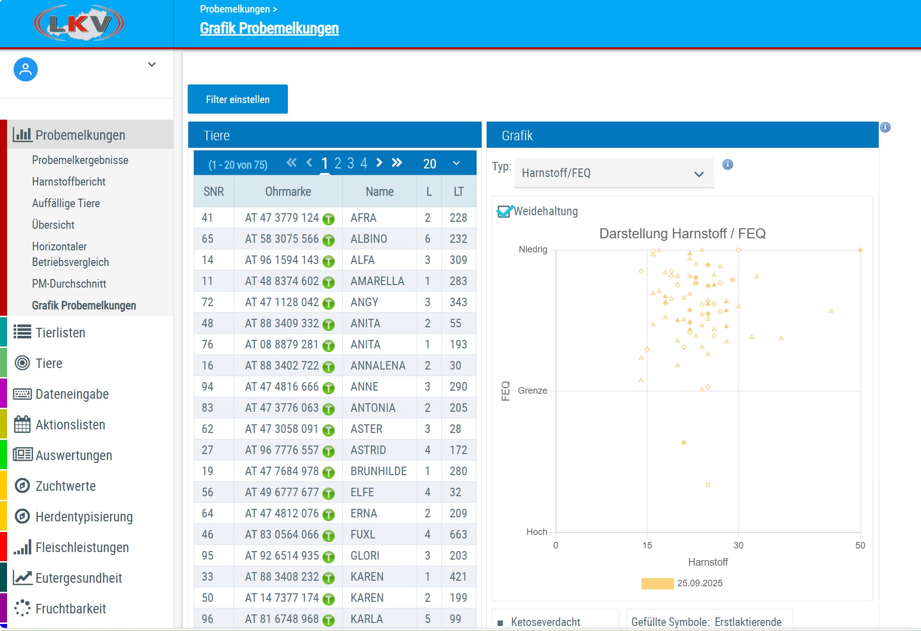 Unter Probemelkungen > Grafik Probemelkungen ist es nun wieder möglich mehrere Tiere zu fixieren/markieren. Halten Sie dazu die “Strg” Taste gedrückt und klicken Sie in der Tabelle auf jene Tiere, die Sie markieren möchten. Die ausgewählten Tiere werden in der Grafik eingekreist.