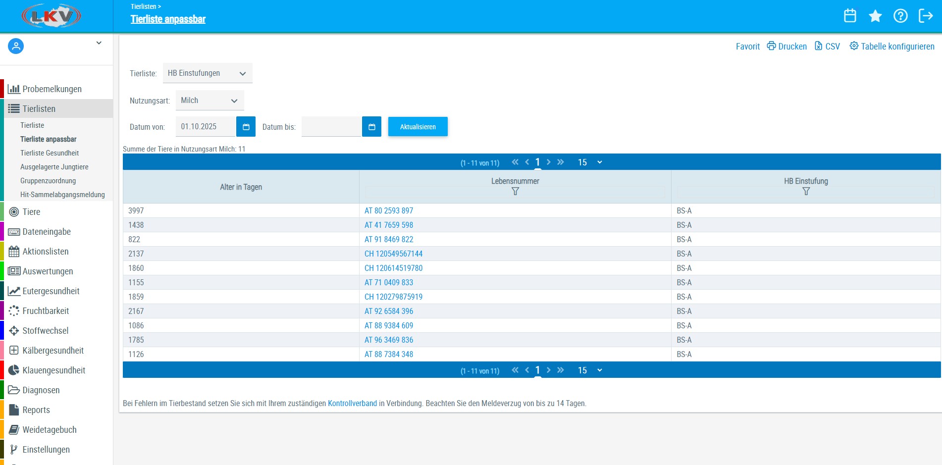 Erweiterung der Tierliste anpassbar um die Herdebuchklasse