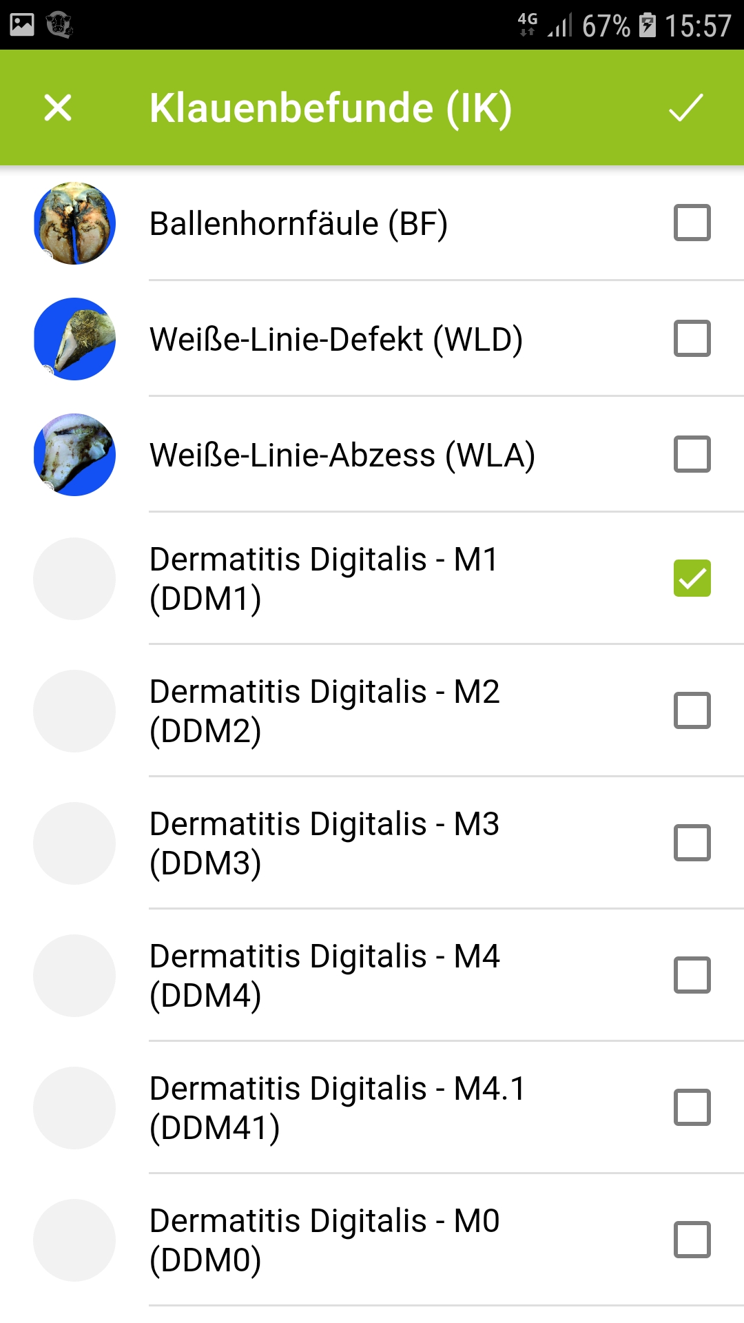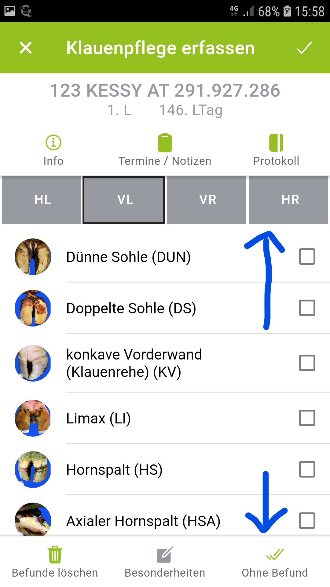 Klauenbefunde können mittels Klick ausgewählt werden