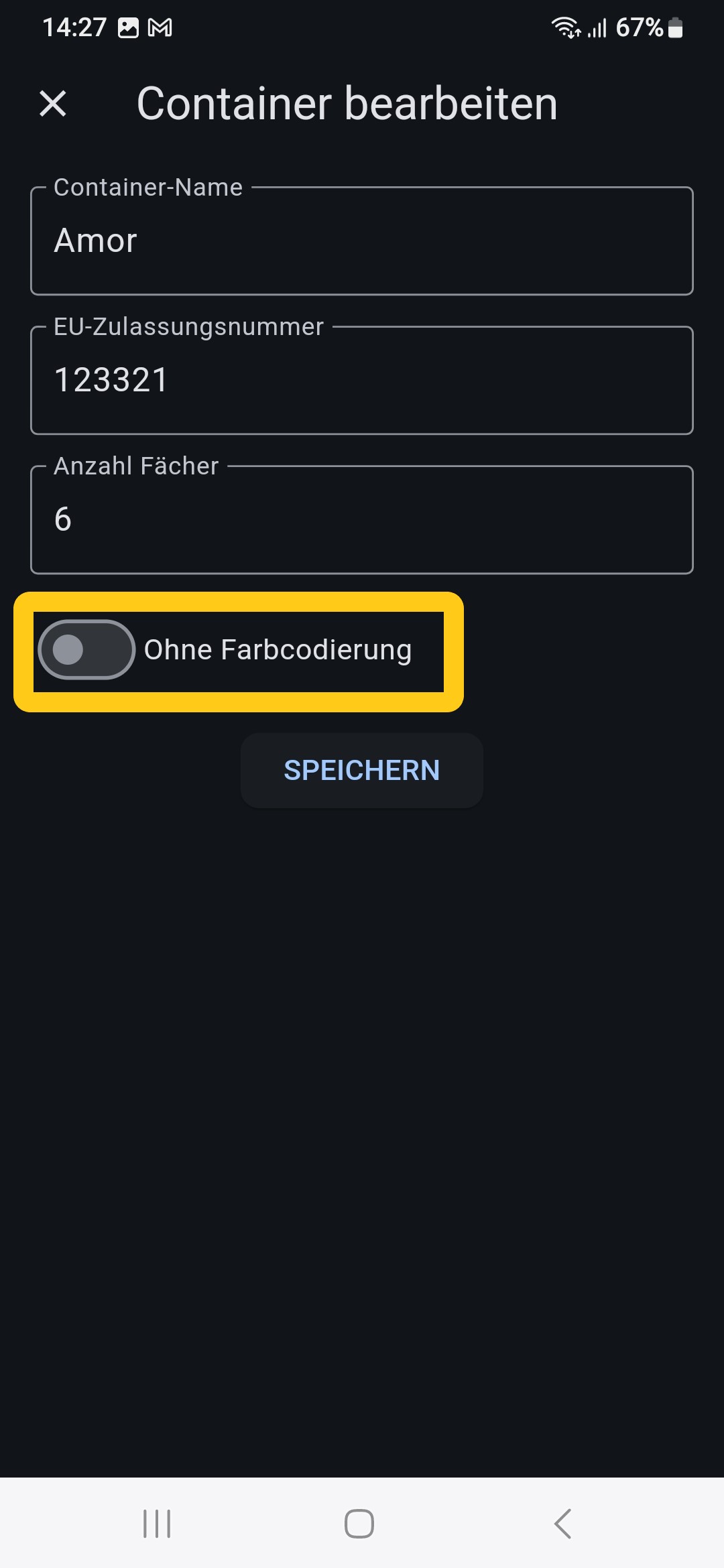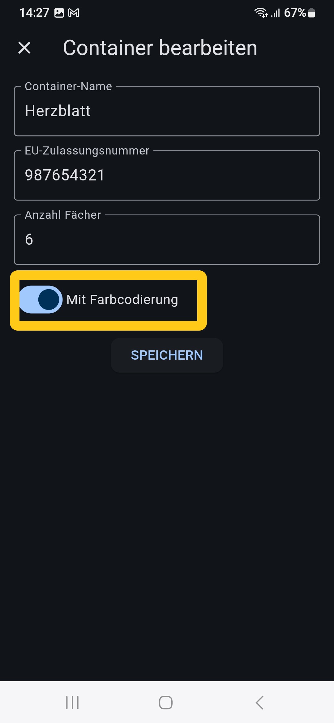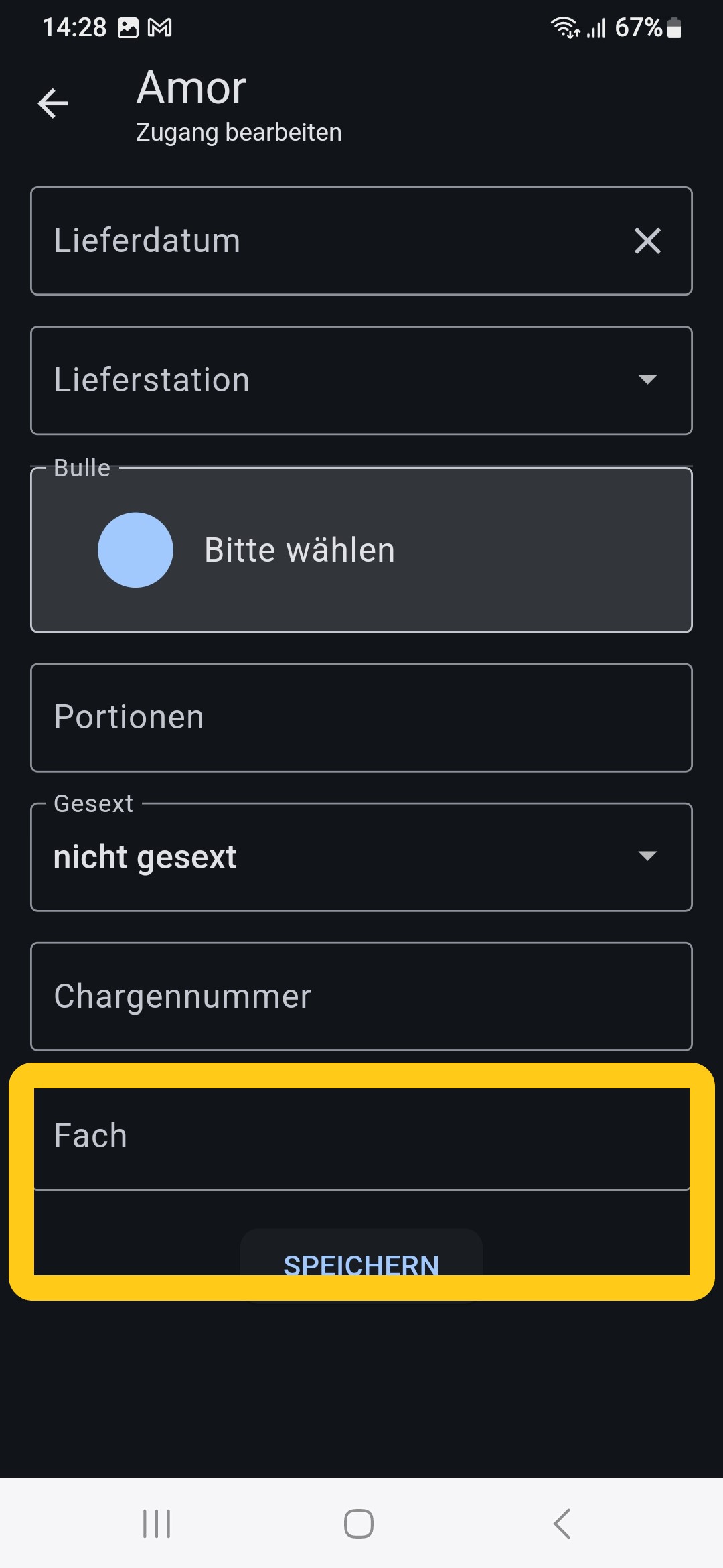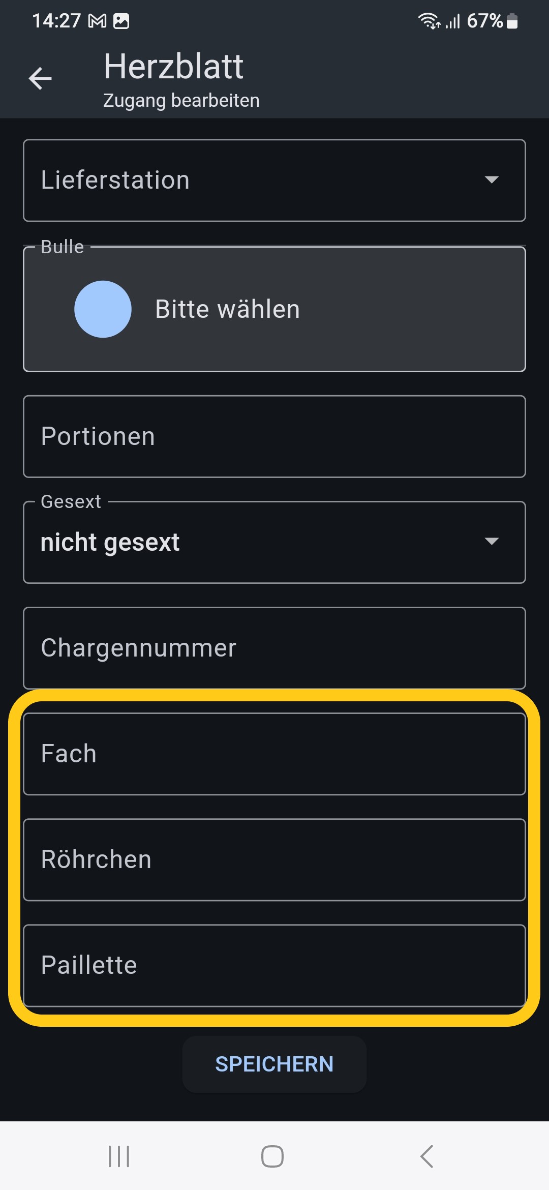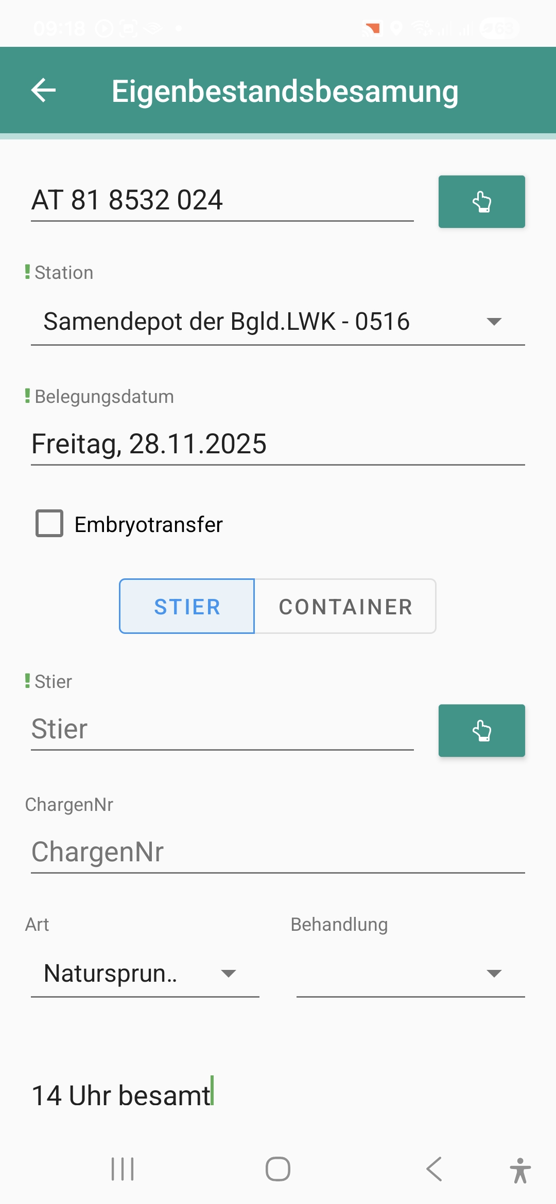 Wenn ein Landwirt die App Container Verwaltung nutzt, so wird in dieser Ansicht neben der “Stiernummer”, die Auswahl “Container” angeboten. Wenn “Container” angeklickt wird, so werden alle Stiere, die in der App Container Verwaltung angelegt wurden, angezeigt. Inkl. der Informationen “Fach”, “Farbe Röhrchen” und “Farbe Pailette”. Wenn eine Besamung mit einem der Stiere aus dem Container gespeichert bzw. abgesendet wird, so wird die Anzahl an verfügbaren Portionen von diesem Stier in der App angepasst.